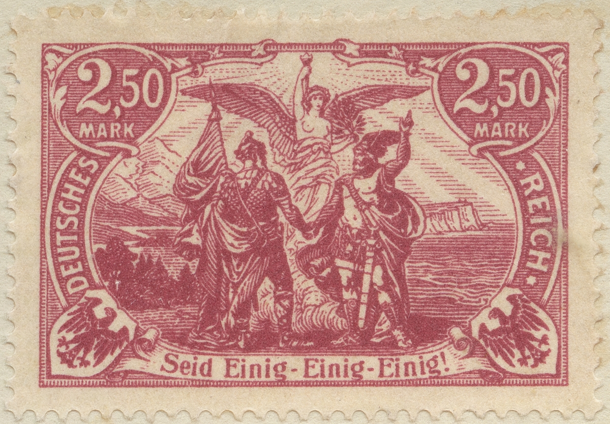 Frimärke från Tyskland, 1900. Motiv av Allegori: Tyskland -Nord- och Sydtyskland förenade- "Seid Einig-Einig-Einig!"