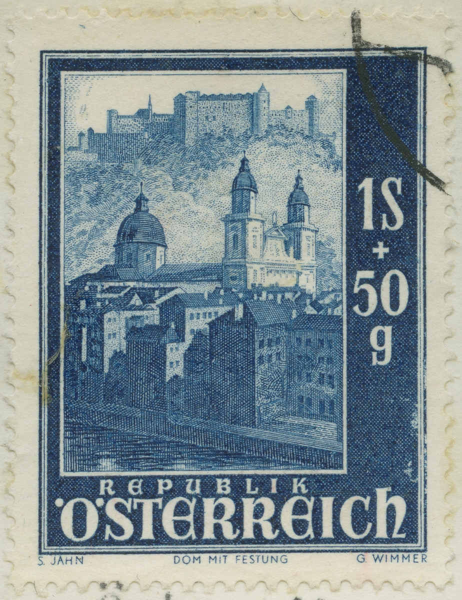 Frimärke från Österrike, 1948. Motiv av Salzburgerdomen och fästningen. "Serie till förmån för katedralens restauration".