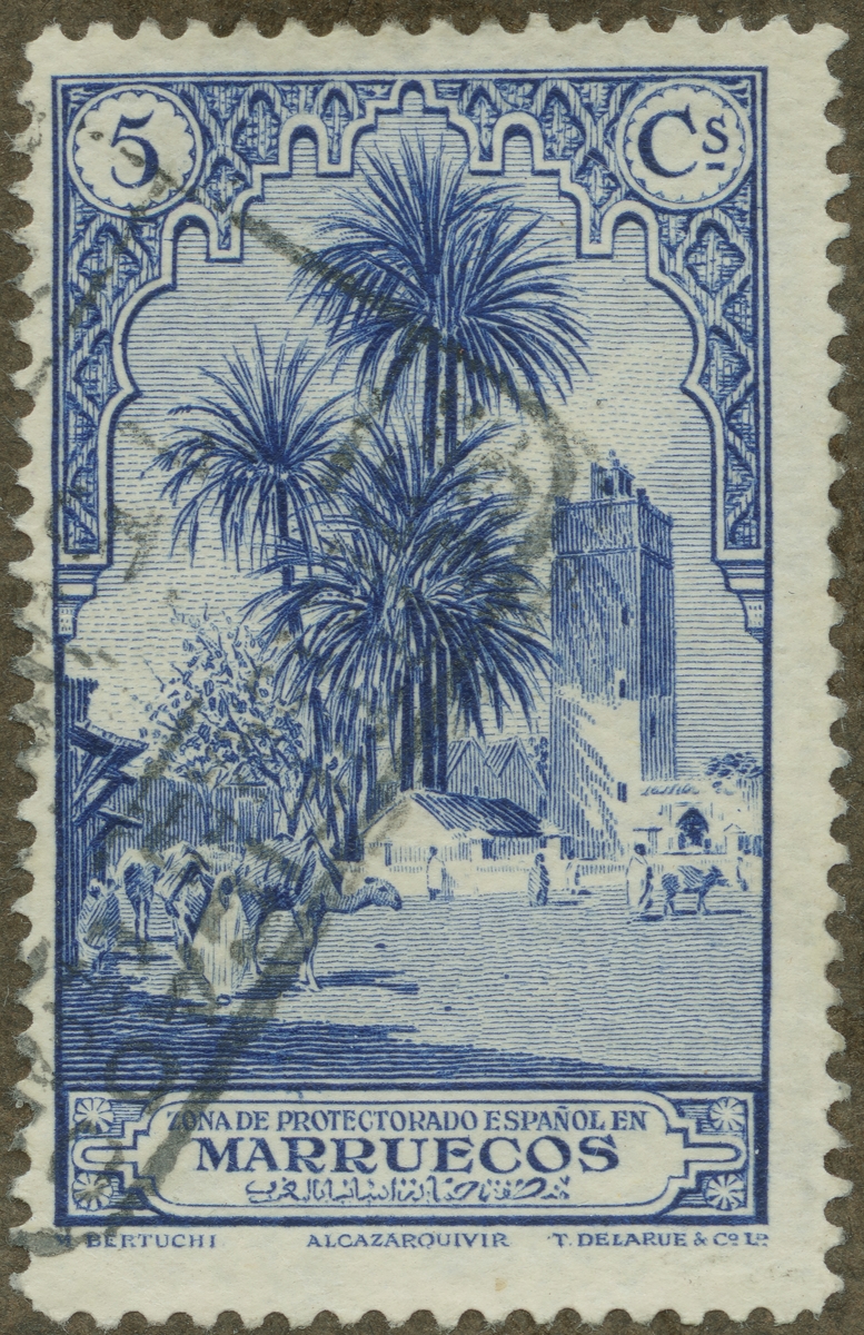 Frimärke från Spanska Marocko, 1928. Motiv av moskéen i Alcazarquivir.