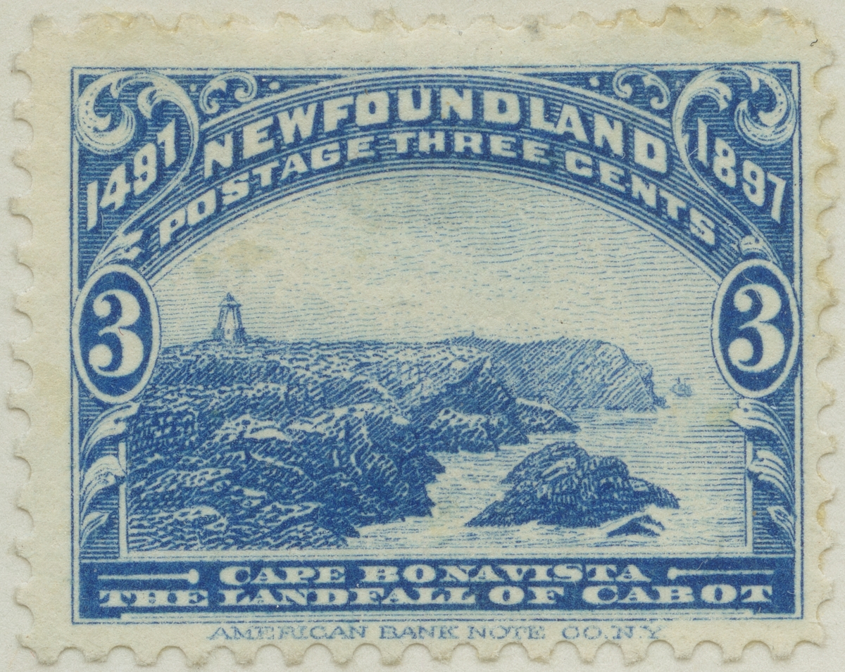 Frimärke ur Gösta Bodmans filatelistiska motivsamling, påbörjad 1950. Frimärke från Canada New Foundland, 1897. Motiv av Kap Bonavista: "John Cabots landstigningsplats 1497. (=Giovanni Cabotto, f. troligen i Genua) 400-årsminne: 1497-1897 samt 60-årsminne av Drottning Viktorias tronbestigning."