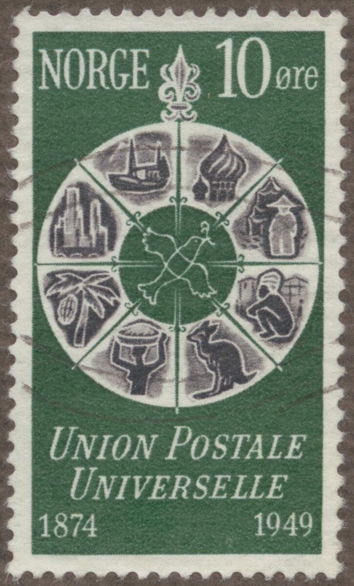 Frimärke från Norge, 1949. Motiv av Etnografika från skilda världsdelar 75-årsminne av Världspostföreningen 1874-1959