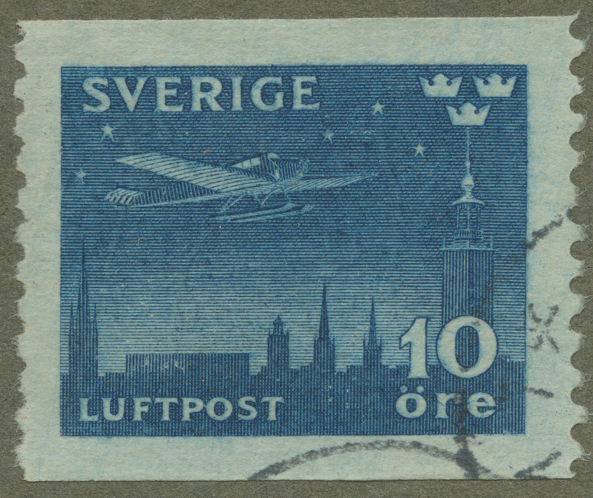 Frimärke från Sverige, 1930. Motiv av Hydroplan av Junkertyp över Stockholm. -Minne av öppning av nattpostflygning-