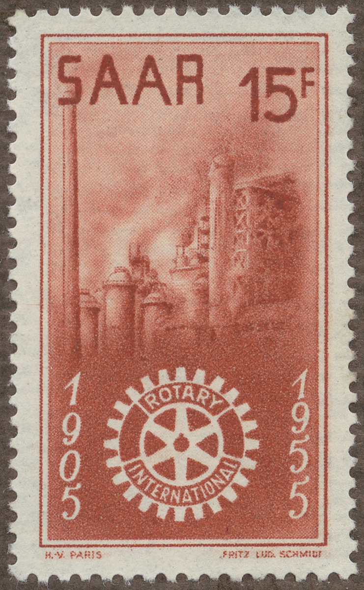Frimärke från Saar, 1955. Motiv av Järnverksbyggnader Rotary International 50 år: 1905-1955.