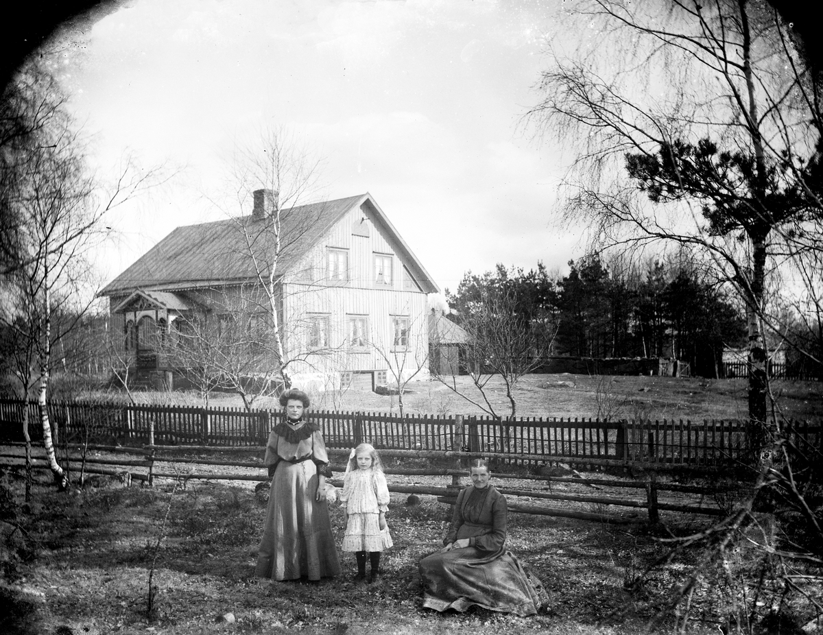 Två kvinnor och ett barn framför bostadshus på okänd plats i Kronobergs län, ca 1900-1910.