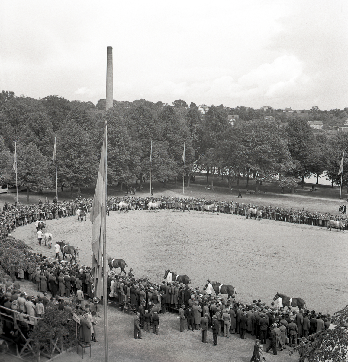 Hästpremiering. Vy från läroverket ner över skolgården med pågående hästvisning.
