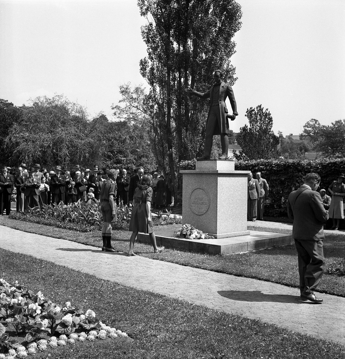 Nykterhetsfolkets dag. Kransnedläggning av några scouter, vid Peter Wieselgrens staty i Linnéparken.