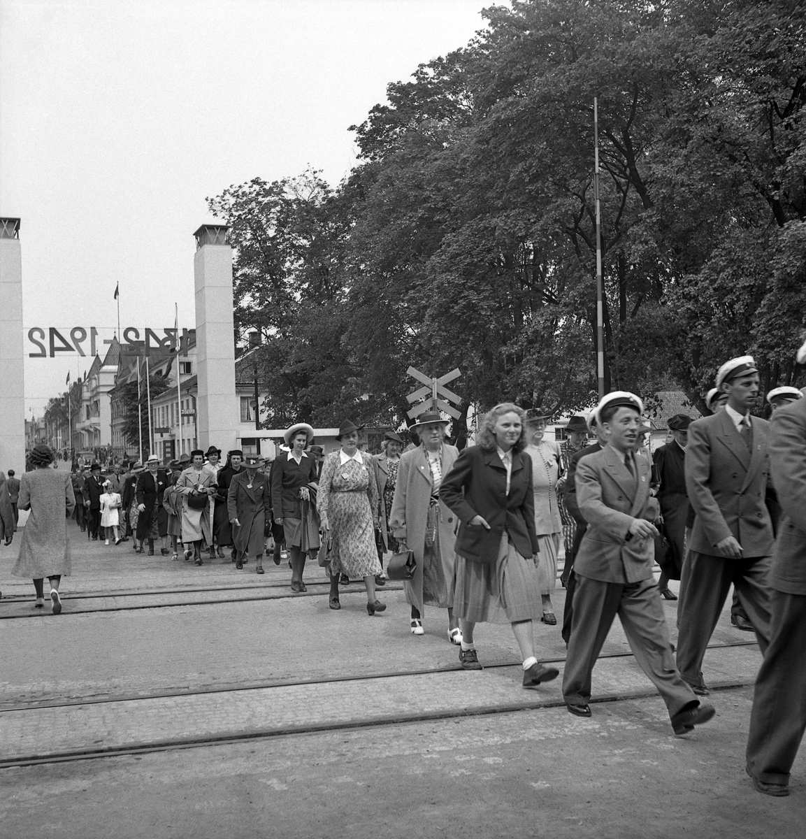 Hantverkets dag. Ett demonstrationståg är på in genom entrén till jubileumsutställningen i Kronobergsgatans förlängning.