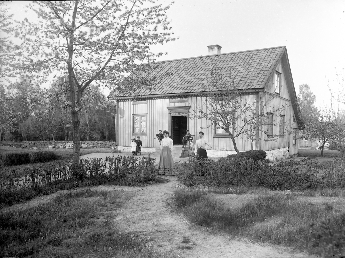 Familj uppställd framför ett hus. Okänd plats, 1905.