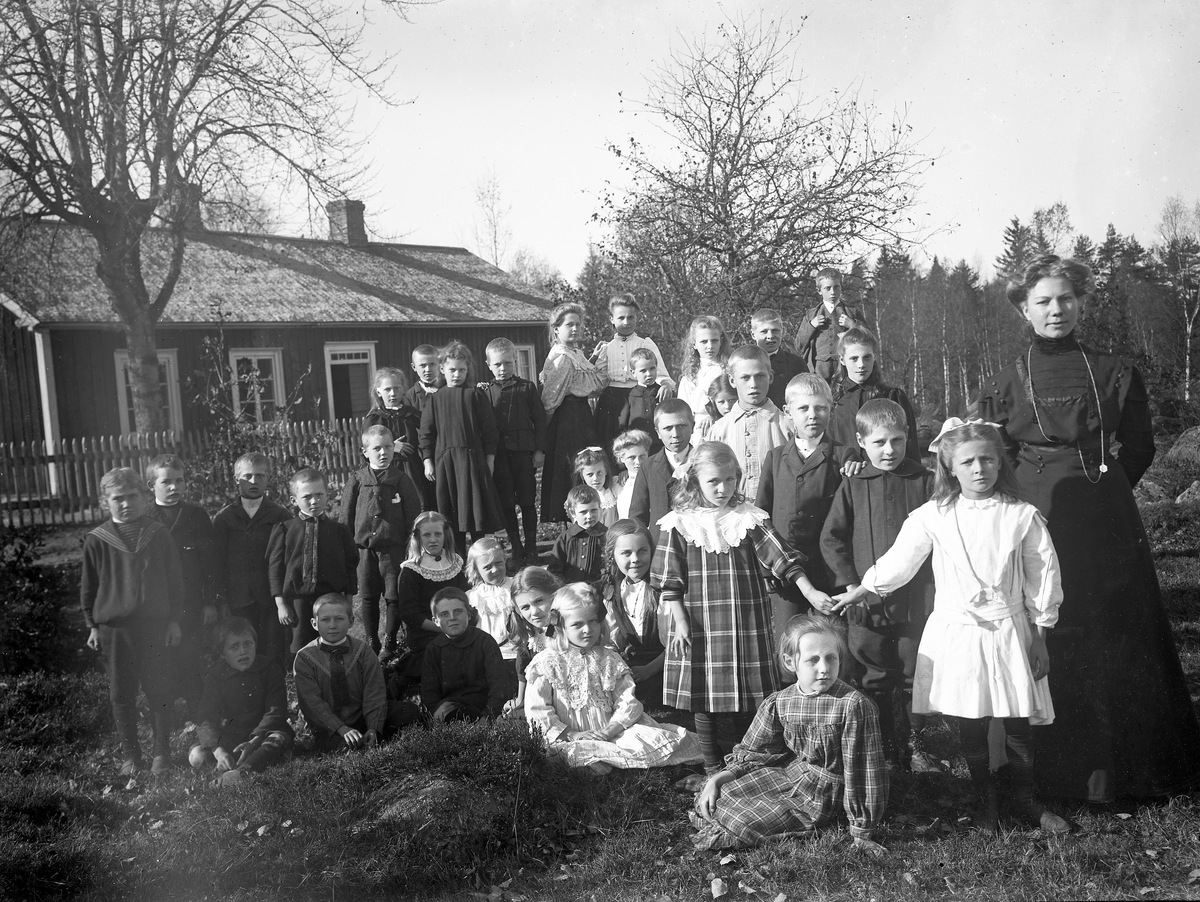 Klassfoto. Skolklass vid en mindre skola. Ca. 1905. Okänd plats, troligen i Kronobergs län.