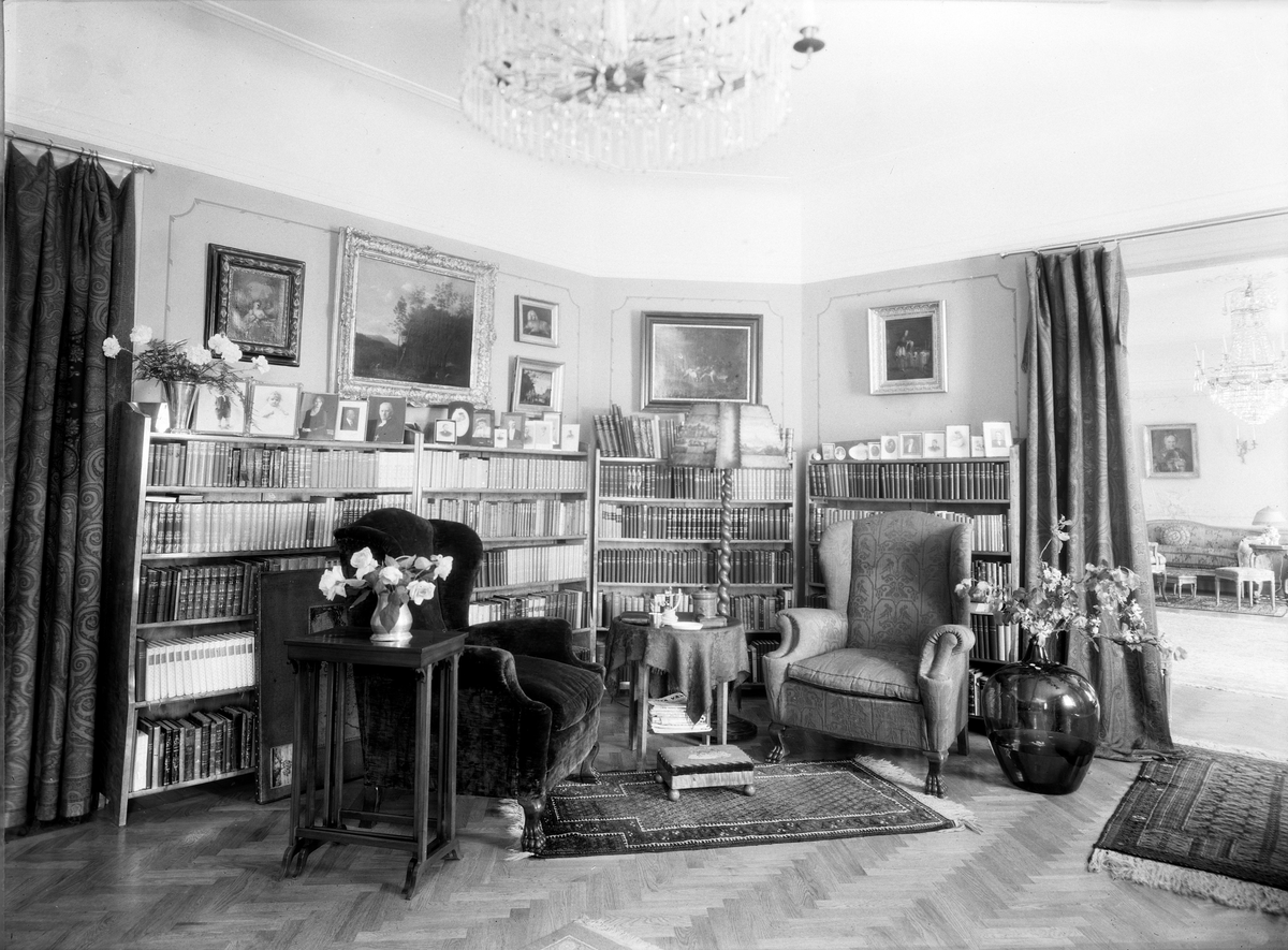 Interiör av bibliotek. Bellinders lägenhet på Storgatan.