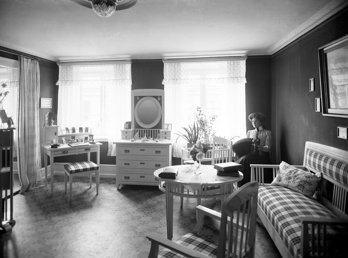 En kvinna med dragspel i ett vardagsrum. Okänd lägenhet i Växjö.