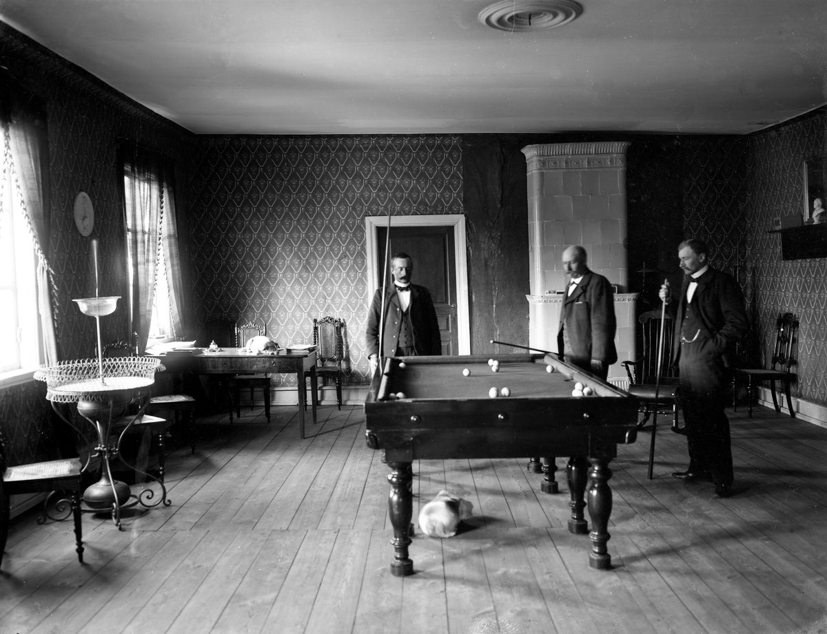 Tre herrar spelar biljard. Isak Johnsons hem vid Skärvet i Växjö. Interiör av biljardsal.