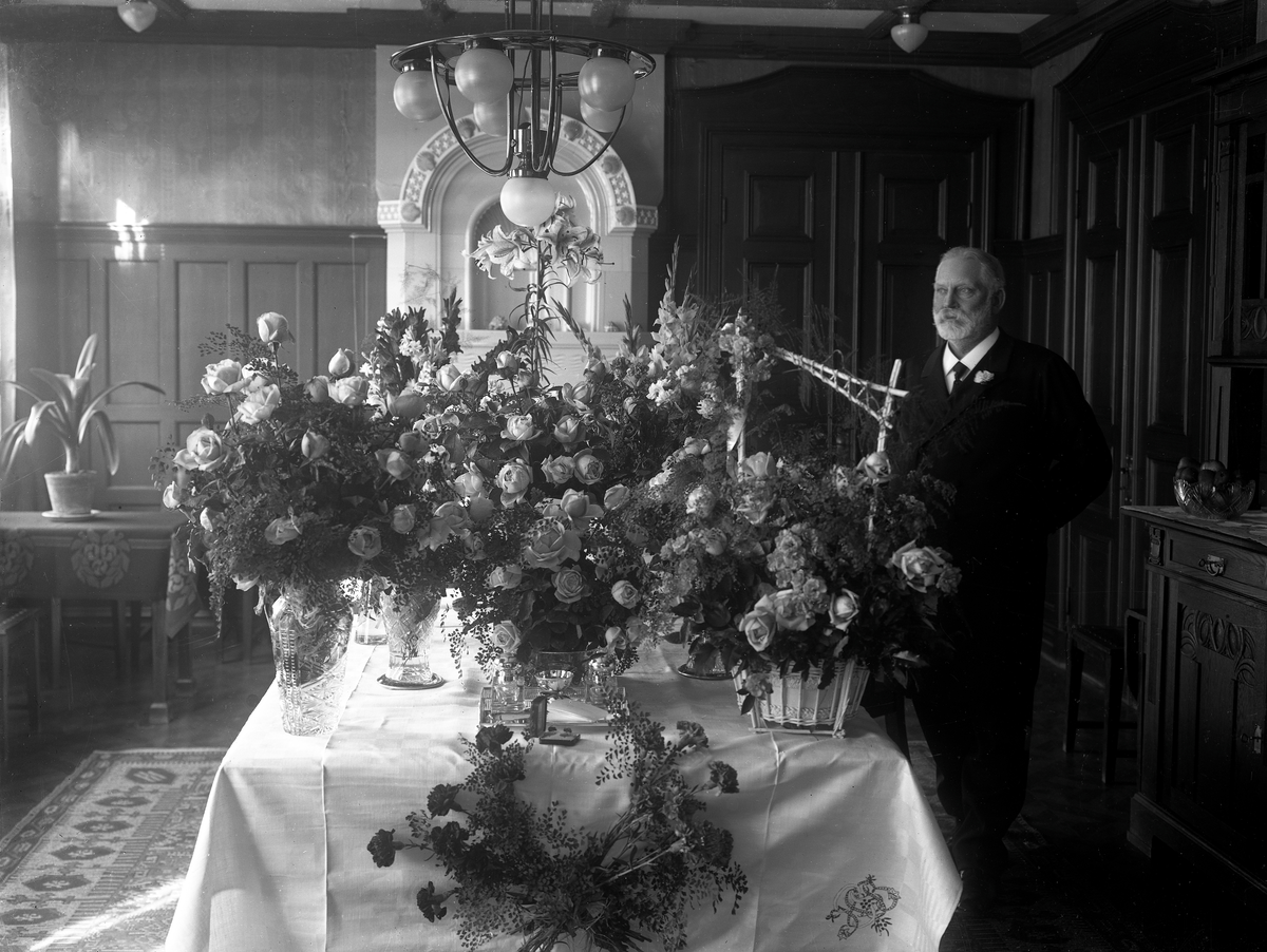 Födelsedagsfirande, en man vid bord fyllt med blommor. Okänd bostad i Växjö.
