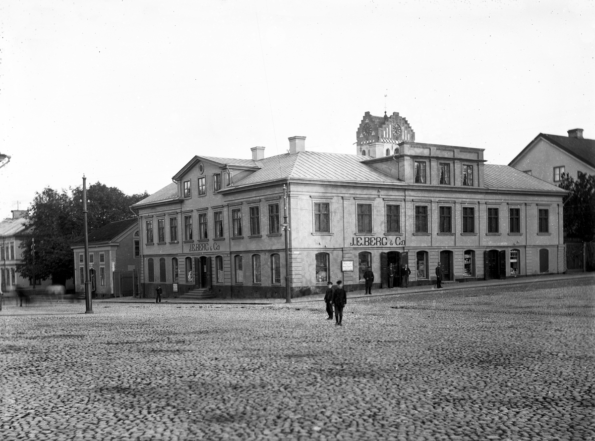 J.E. Bergs fastighet i hörnet Storgatan / Kronobergsgatan. Kv. Lejonet. Fotograferat från Stortorget. I bakgrunden skymtar domkyrkotornet.