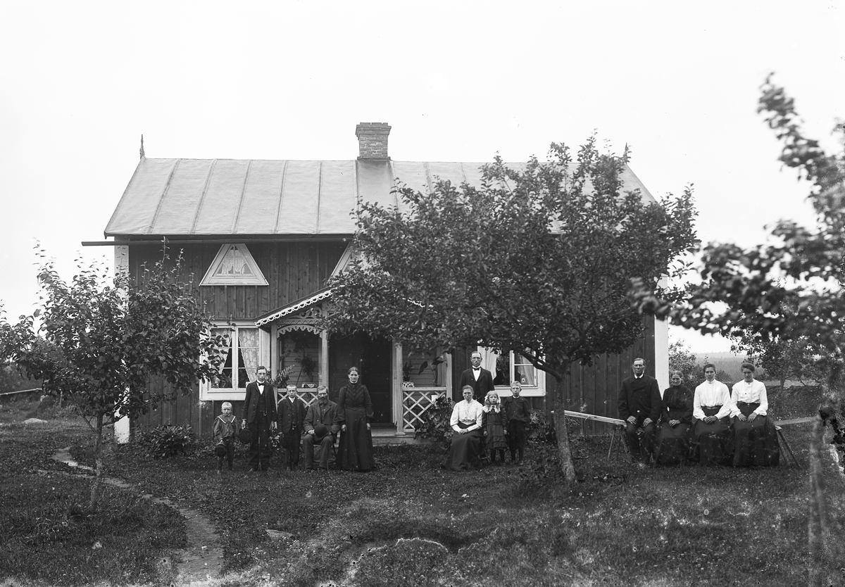 En familj framför bostadshus på okänd plats i Kronobergs län.