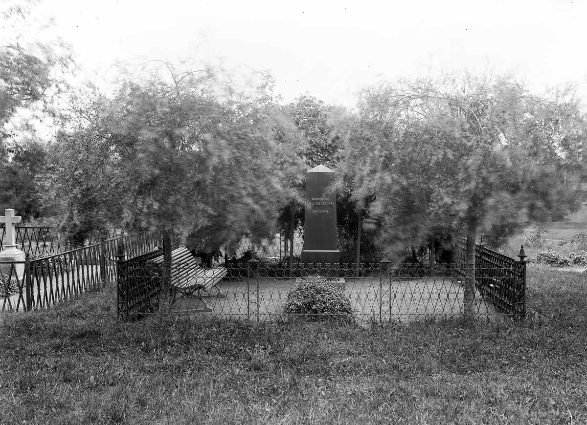 Komminister J.C.A. Collanders familjegrav. Gravplats med gravsten och ett omgärdande gjutjärnsstaket. Okänd plats. Möjligen Östra Torsås.