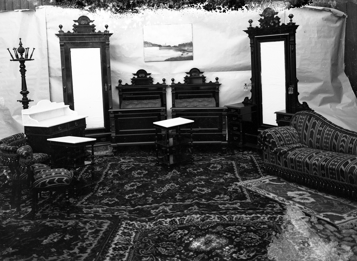 Möbler uppställda för utställning eller foto. Trol. J.P. Jönssons Möbleringsaffär på Norrgatan 12. Ca. tidigt 1900-tal.