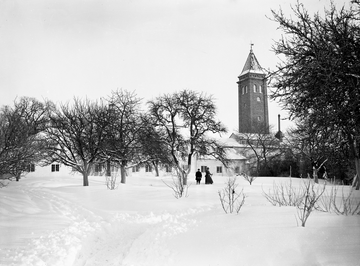 Ingelstad säteri med utsiktstorn, parken i vinterskrud. Tidigt 1900-tal.