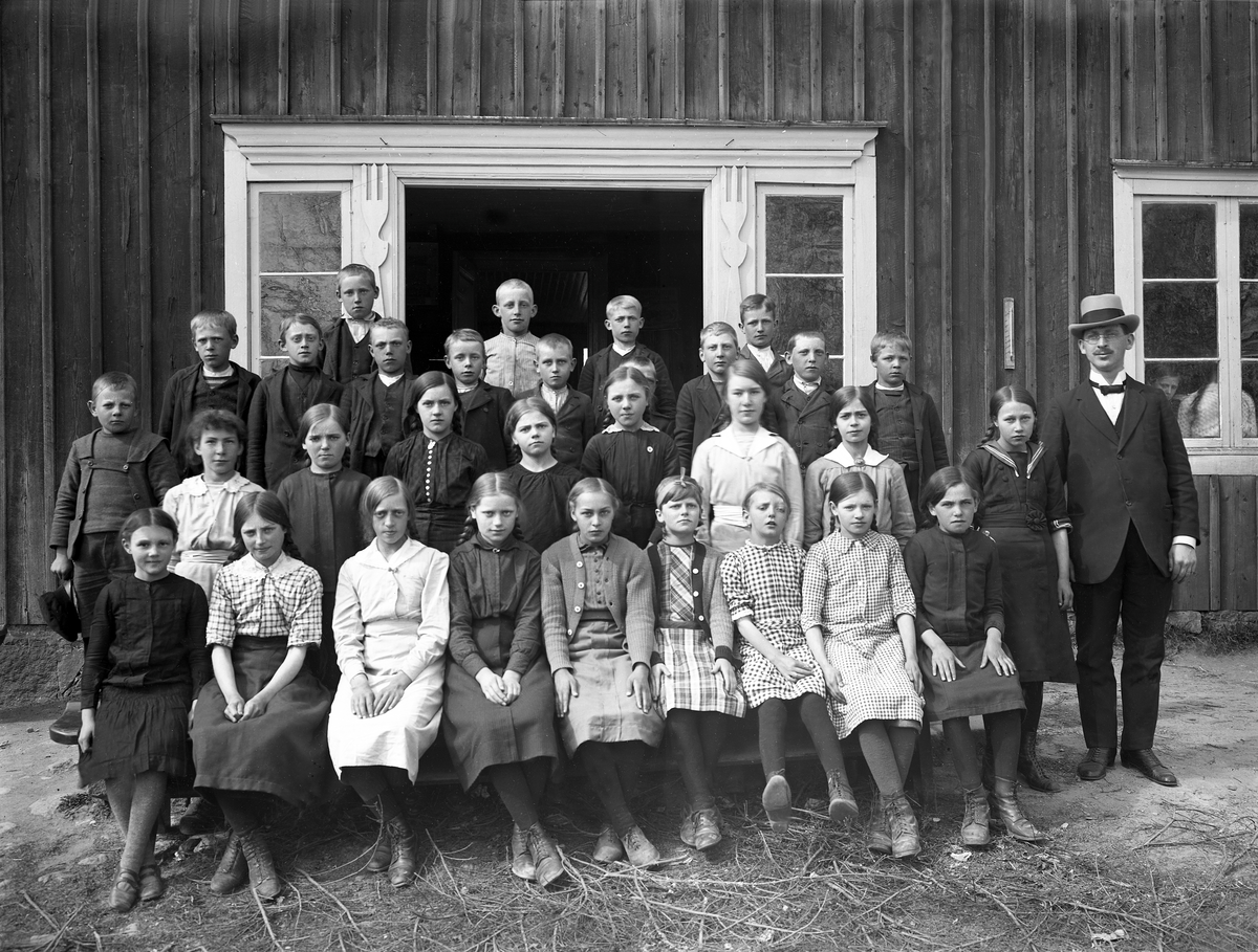 Klassfoto. Skolklass utanför en mindre skola. Ca. 1916. Okänd plats, troligen i Kronobergs län.