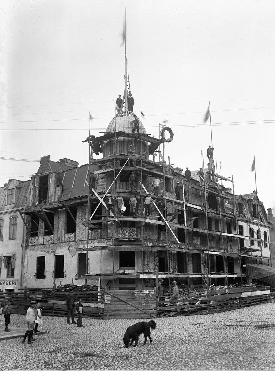 Feukska huset i hörnet Storgatan - Bäckgatan under uppbyggnad, 1908.