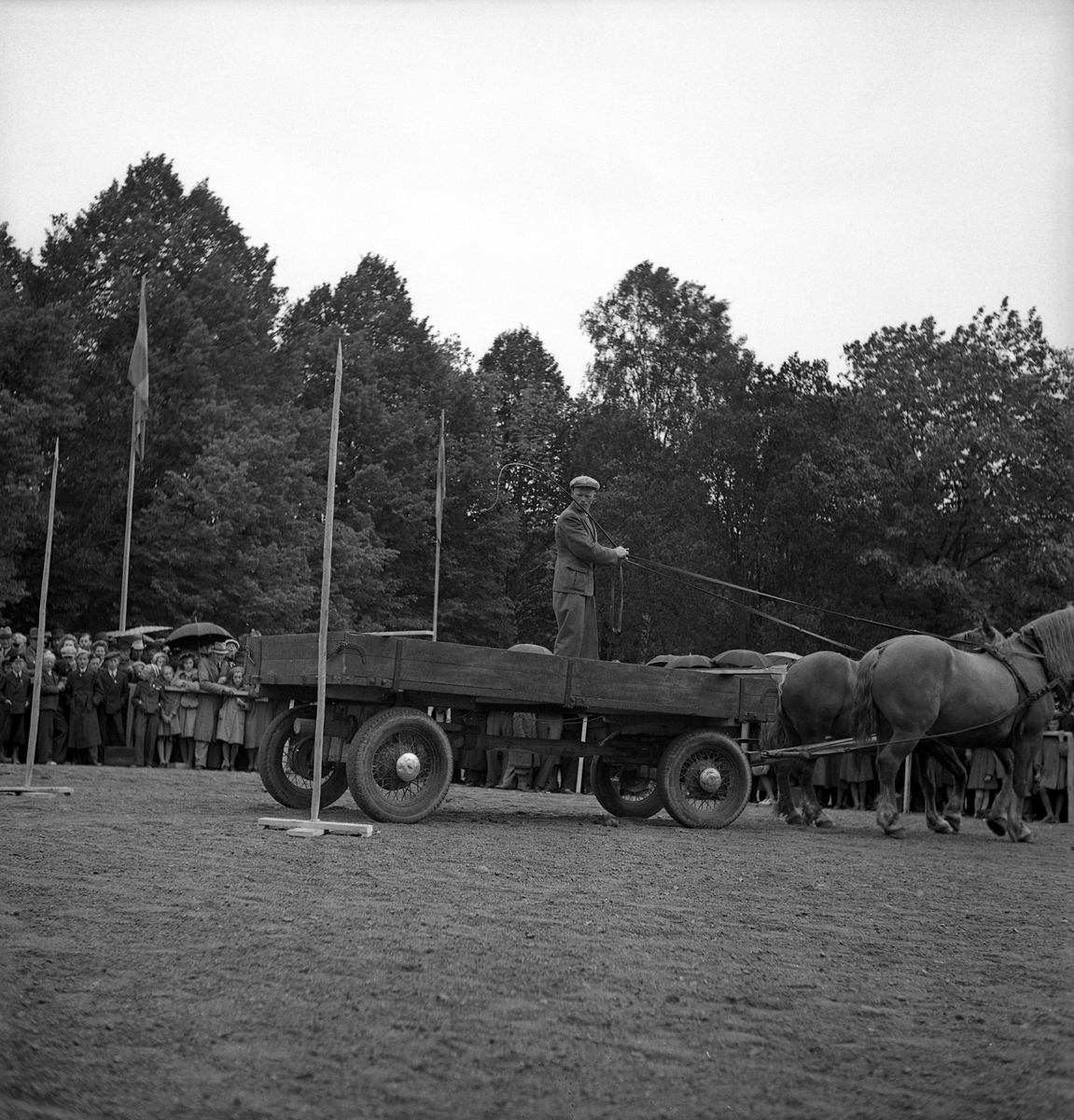 Titel: Lantbruksmötet. En stående man kör tvåspann längs en bana runt läroverkets skolgård.