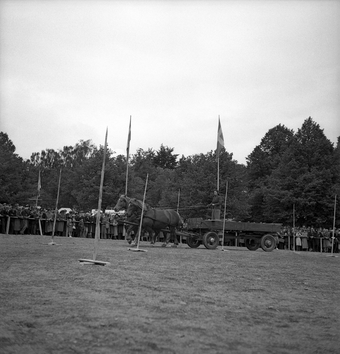 En stående kvinna kör tvåspann på en bana runt skolgården till läroverket.