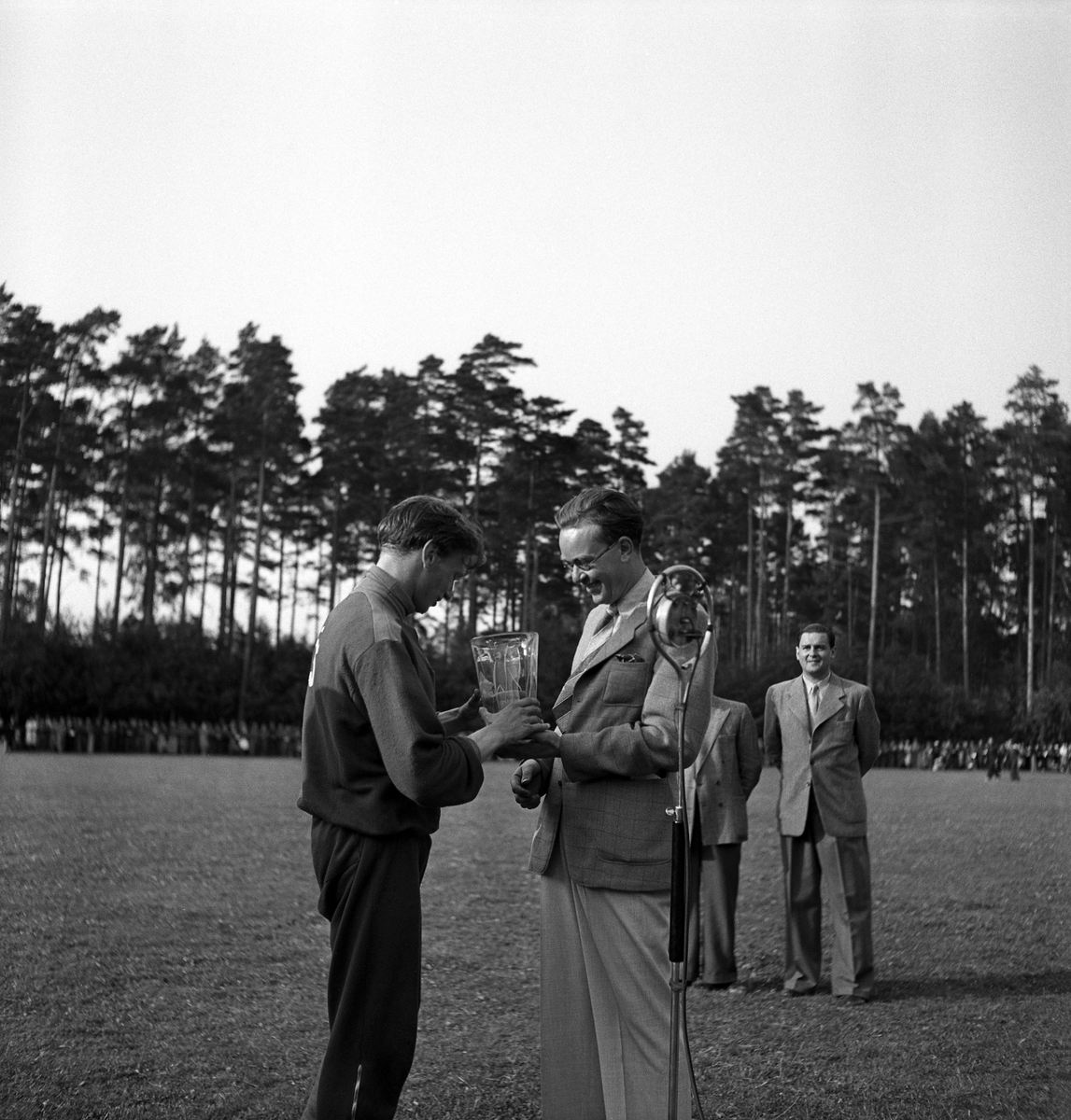 Idrottens dag på Värendsvallen. Prisutdelning. En man får en stor, graverad glasvas i pris.