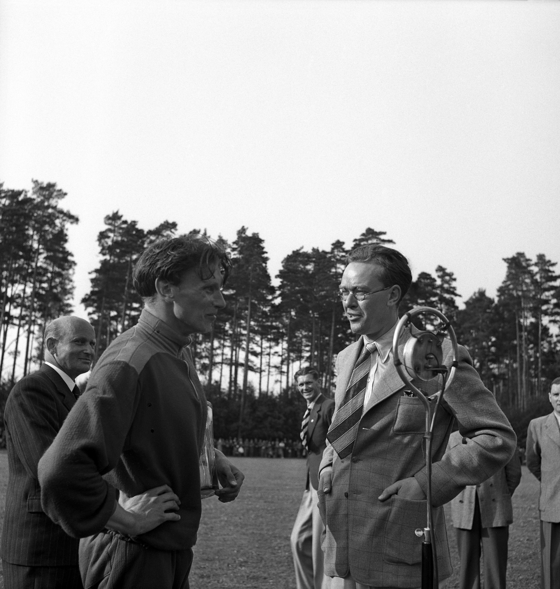 Idrottens dag på Värendsvallen. Prisutdelning. En man i träningsoverall blir intervjuad.