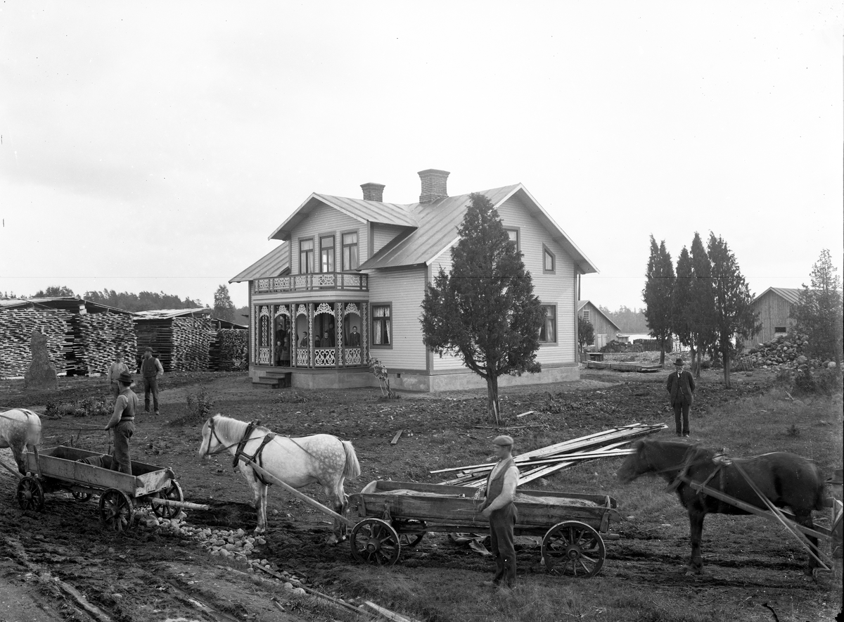 Stort bostadshus vid sågverk. Brädgård. Ca. 1905, okänd plats i Kronobergs län.