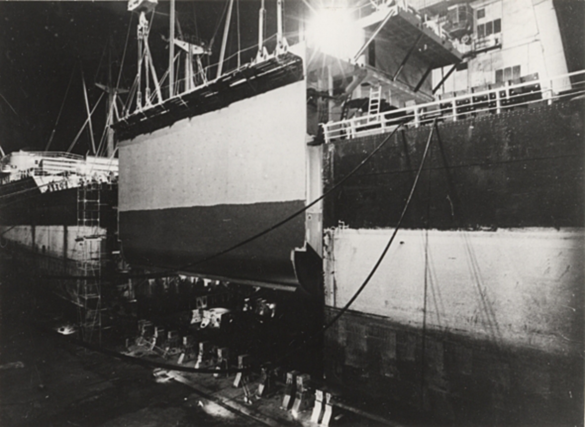 "Den ny lastrumssektion anbriges på sin plads i skibet."