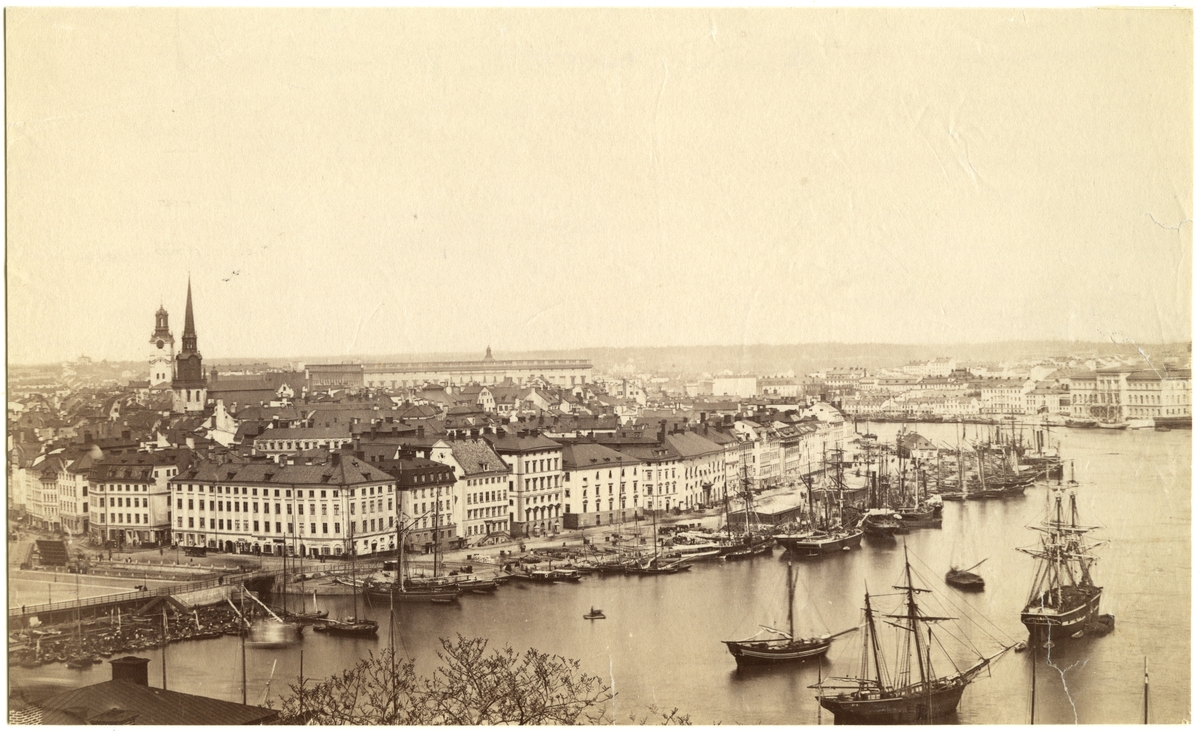 Stockholms hamn. Skeppsbron någon gång mellan 1866 - 1878. Nationalmuseum färdigbyggt.