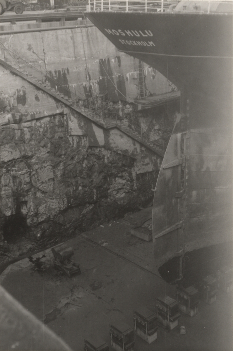 F.d. 4-mastbarken MOSHULU i Gustav V:s docka på Beckholmen 1961. Fartyget avriggat för användning som magasinsfartyg. Aktern och rodret.