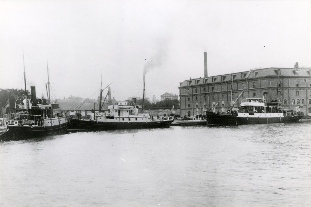 Vy av Kalmar hamn 1916. Vid kajen ligger fr. vänster: s/s Kalmarsund VII, s/s Kalmarsund nr. 6, s/s Kalmarsund VIII.