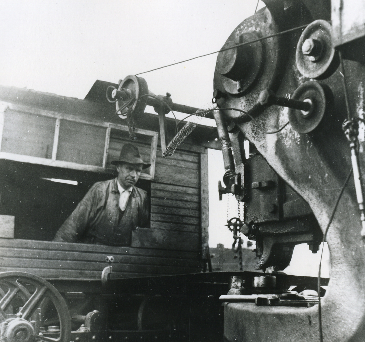 Oskarshamns varv. "Långe-Nisse" eller "Nisse vid pressbordet", Edvin Nilsson, pressar nithål i plåt vid pressbordet. Pressbordet kom omkring 1930.