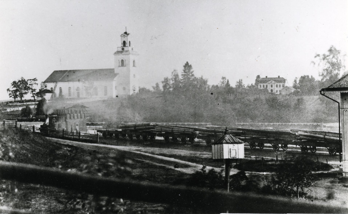 Forsa. Sjöstationen, loket till vänster och kyrkan i bakgrunden. Bilden från 1860.