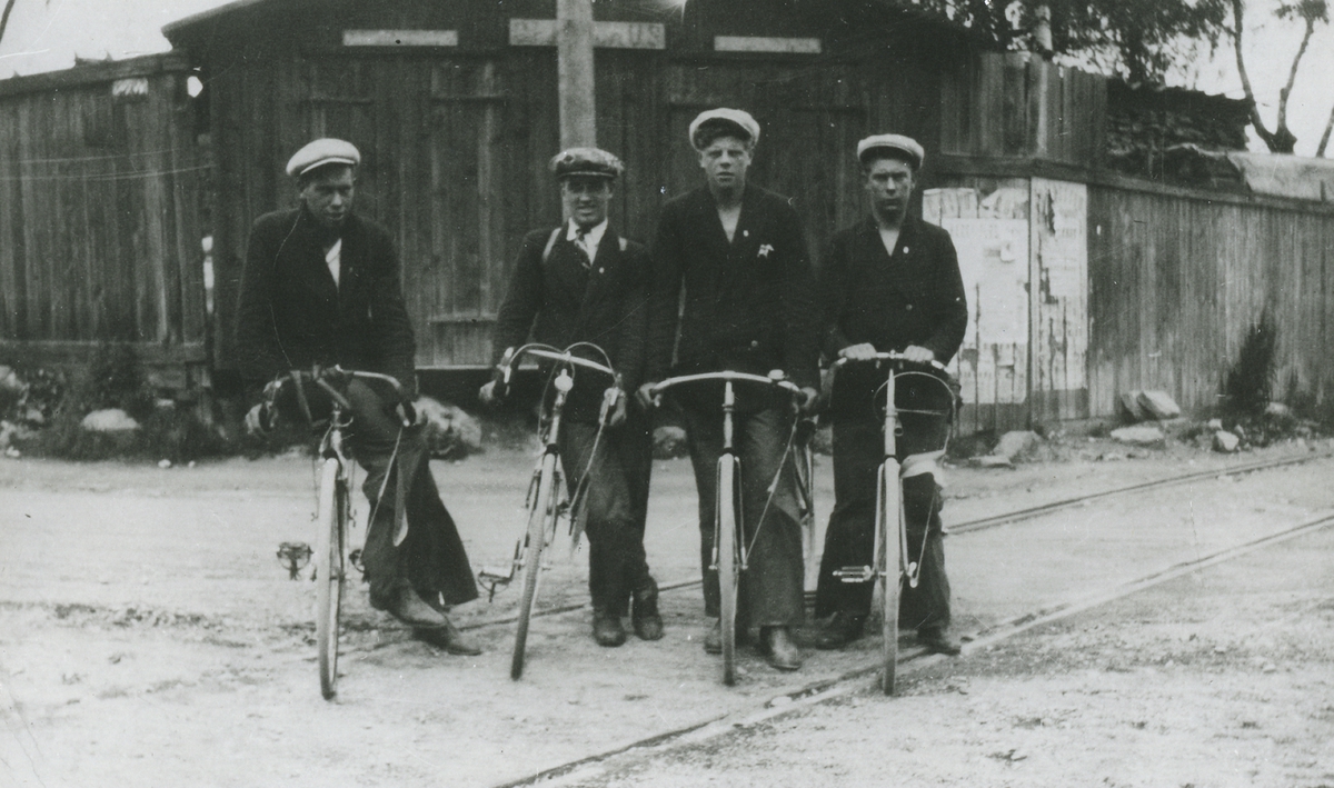 Fyra pojkar från Oskarshamn c:a 1928 vid varvets spruthus återkomna från en cykelsemester till Halmstad. Fr.v. Plåtslagaren Gunnar Lamberg, nitaren Patrik Eriksson, Arbetaren vid Kopparverket, senare polisen, Gustav Nyström och svetsarbasen Harald Berg. Alla utom Nyström var anställda vid Oskarshamns mekaniska verkstad.