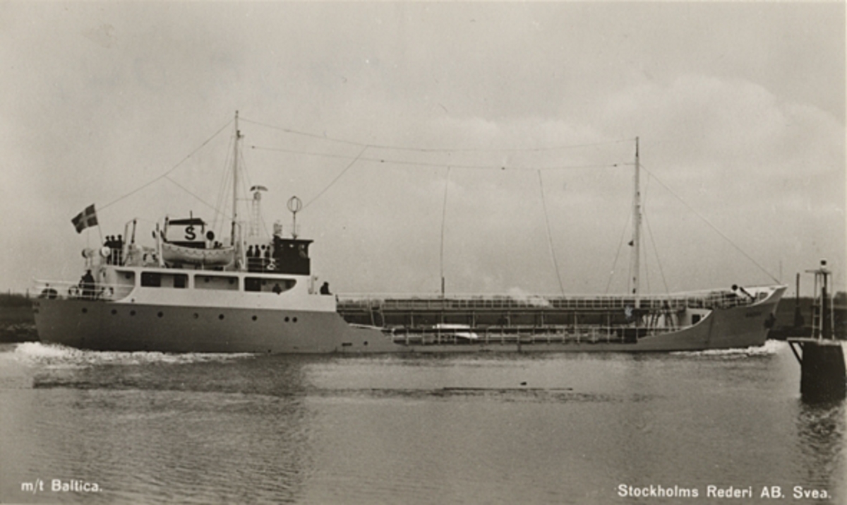 Vykort i svartvitt visande tankmotorfartyget "BALTICA" av Stockholm under gång i skärgården. Vykort från omkring 1966.