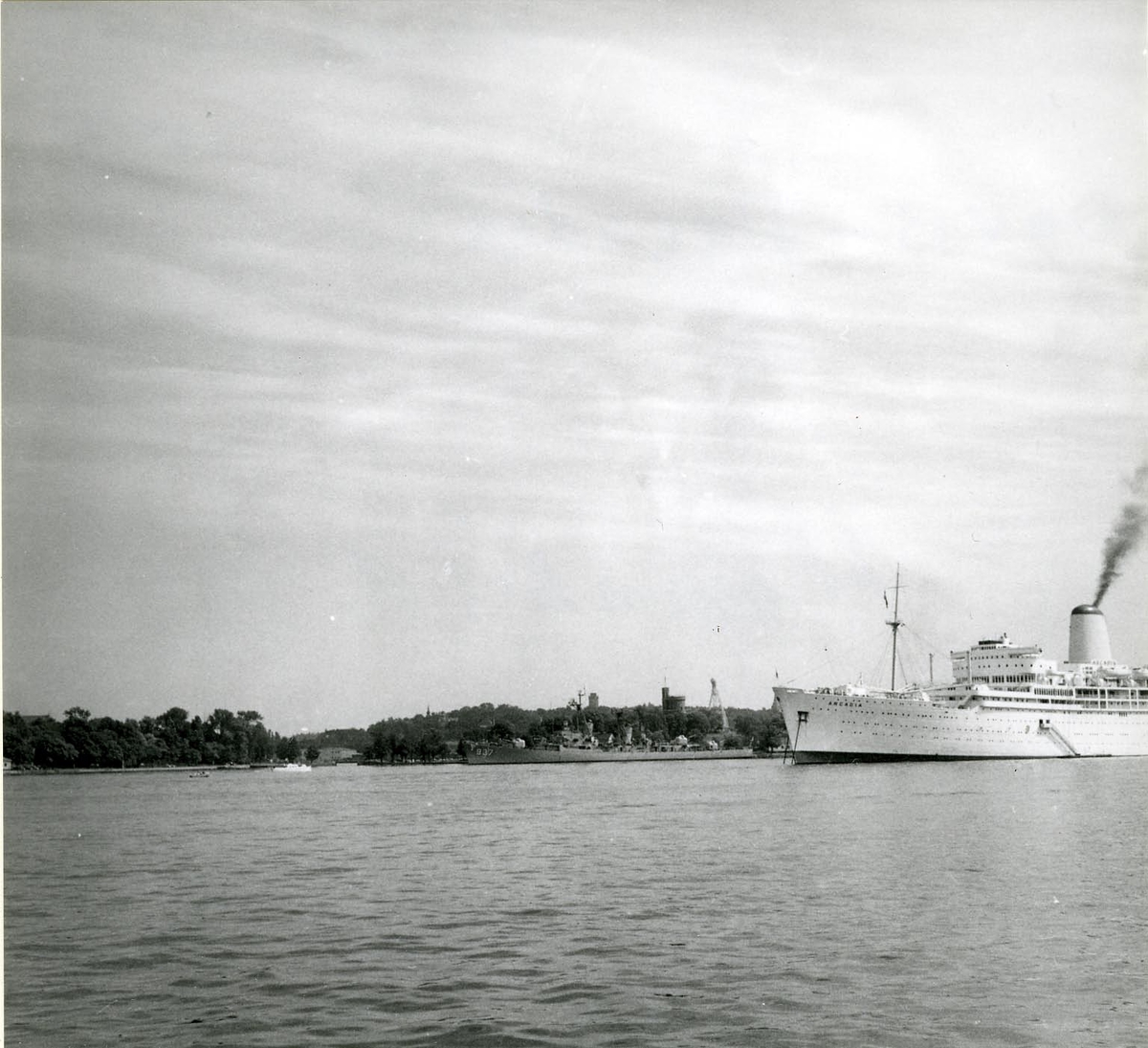 Foto från 1957 visande jagare 937 "Davis" från USA, samt passagerarturbinångfartyg "Arcadia" av London, för ankar på Stockholms ström.