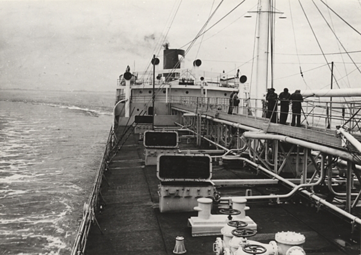 Däcksbild av tankern M/S ARISTON vid provturen 9/6-38 i Göteborgs skärgård. Bilden ur album sänt till Hugo Schuberts 75-årsdag från direktör Hugo Hammar, Götaverken.