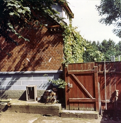 Boningshusets västgavel och planket, som skiljer gårdsplanen från trädgården, sett från väster. Christian Madsens båtbyggeri. Foto N(ils) Nilsson aug (19)64. Danmark, Själland, Lynaes.