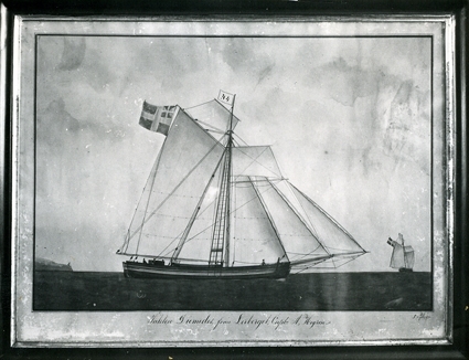 Fartygstavla hos fru Ruth Pålsson. Jakten Diomedes från Lerberget. capt. A. Hagren. Akvarell signerad L. Sjöström. Skåne, Malmöhus län, Viken.