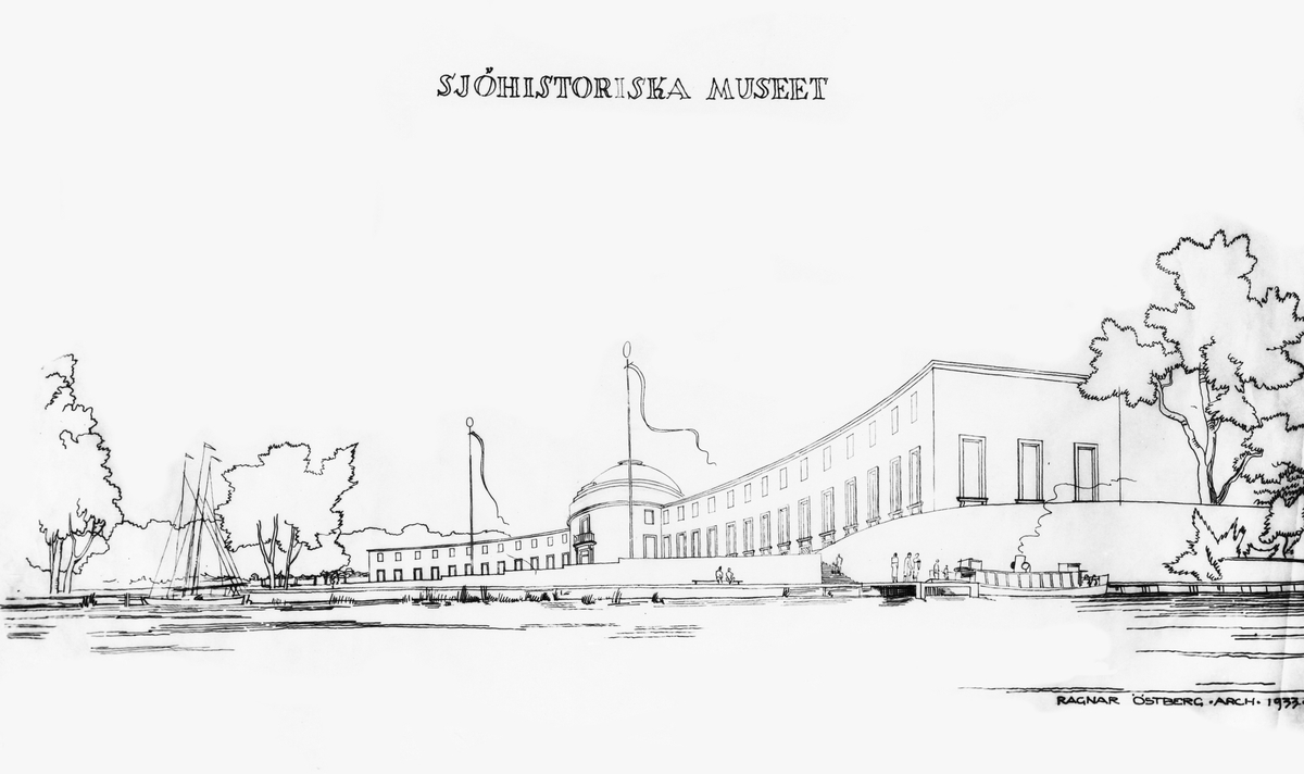 Arkitektskiss av Sjöhistoriska museet utförd av Ragnar Östberg, daterad 1933.