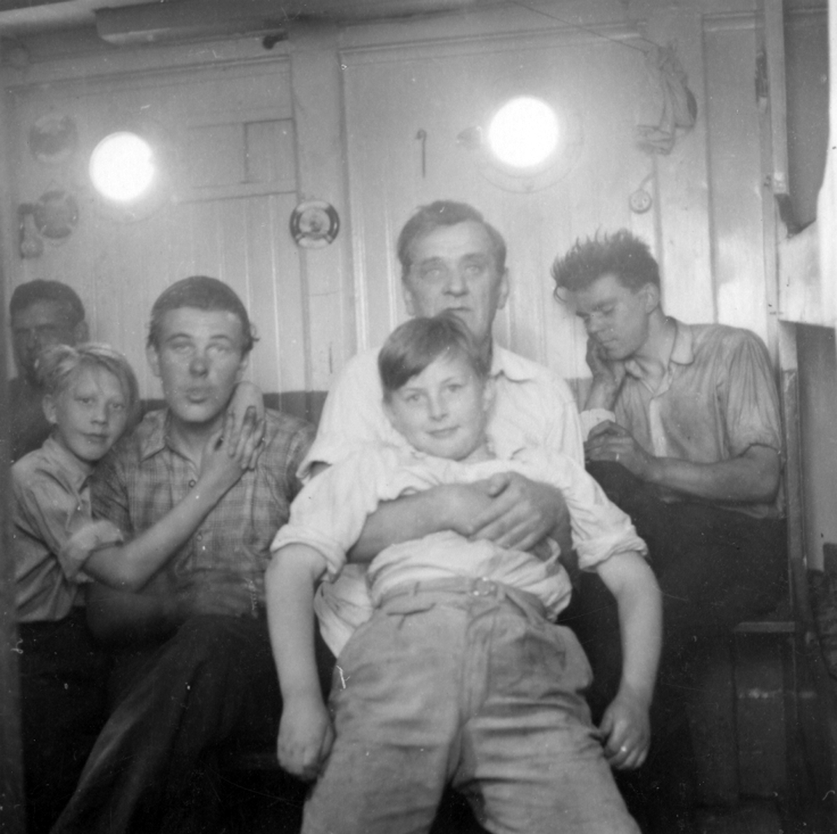 Motorskonaren Lisa av Bergkvara. Interiör från skansen med kock och 3 matroser samt 2 pojkar från land på besök.