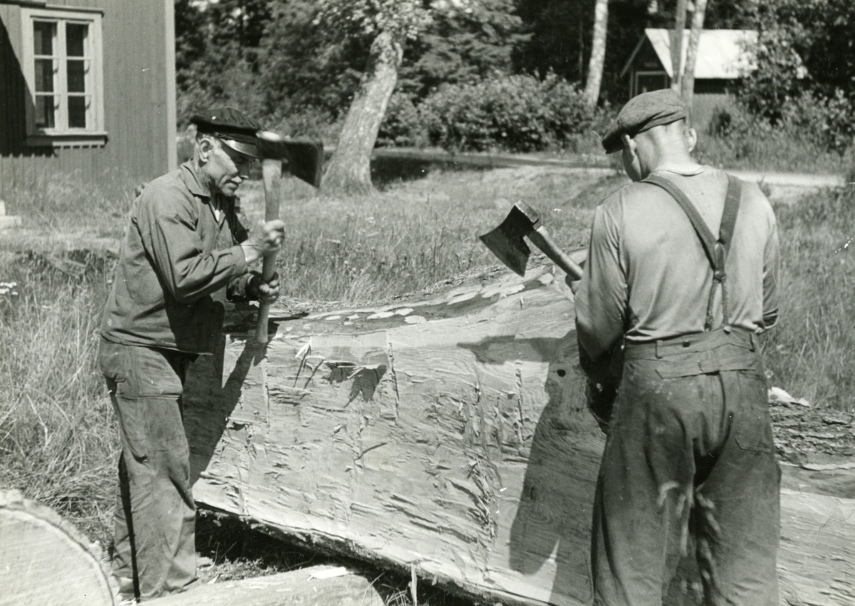 Titel: Sjötorps varv. Skrädning av ekstock till akterstäv- "hjärtstock"- till isländsk fiskebåt under byggnad. Yxorna äro s.k. hjärtumsyxor, större typen. (se foto av sådan under Frihultstillverkningen).