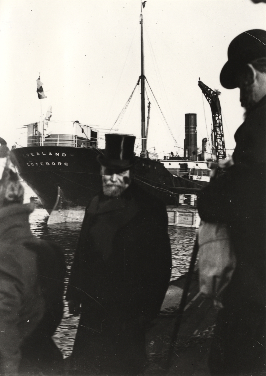 Lastmotorfartyget SVEALAND av Göteborg sett akterifrån. I förgrunden står tre personer.