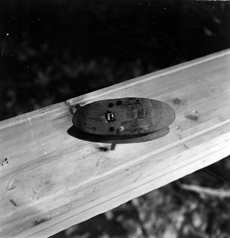 Neg nr 44. Hyvel, "klös", använd vid upphyvling av spikränder i kantprofiler. L 12cm, bladbredd 1 cm, höjd 2cm. Undersidan. Genom de fyra symmetriskt placerade hålen är hyveln omställbar för höger- och vänsterprofiler i två lägen. Foto 6.8 (1962).