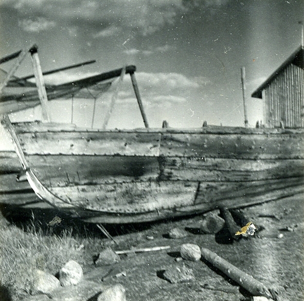 Sönderbråkad skötbåt med täljda vinningar, byggd före 1900.