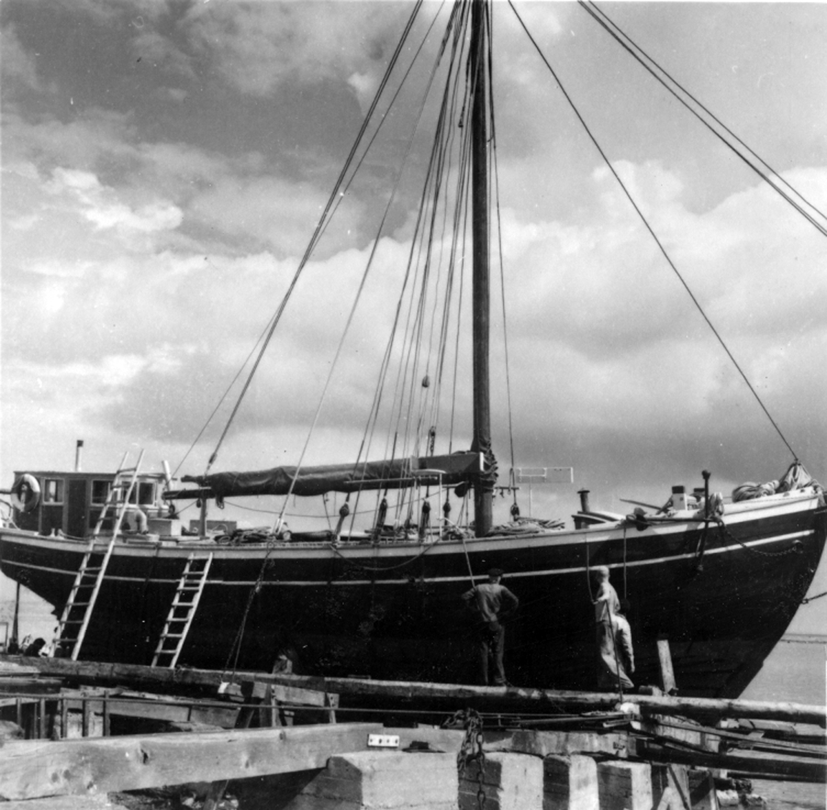 Fredrik Johanssons varv. Jakten Vega av Degerhamn, byggd i Bergkvara 1909. På slipen. Sedd förifrån och från stryrbord.