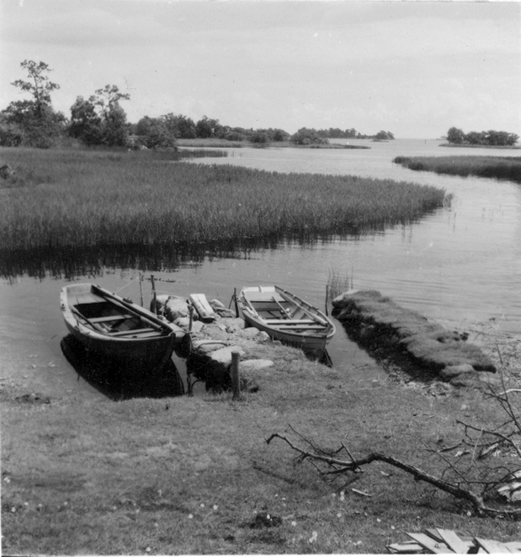 Småland. Kalmar län, Stranda härad, Ålems socken, Pataholm. Hamnen med småbåtar liggande i sina kåsar.