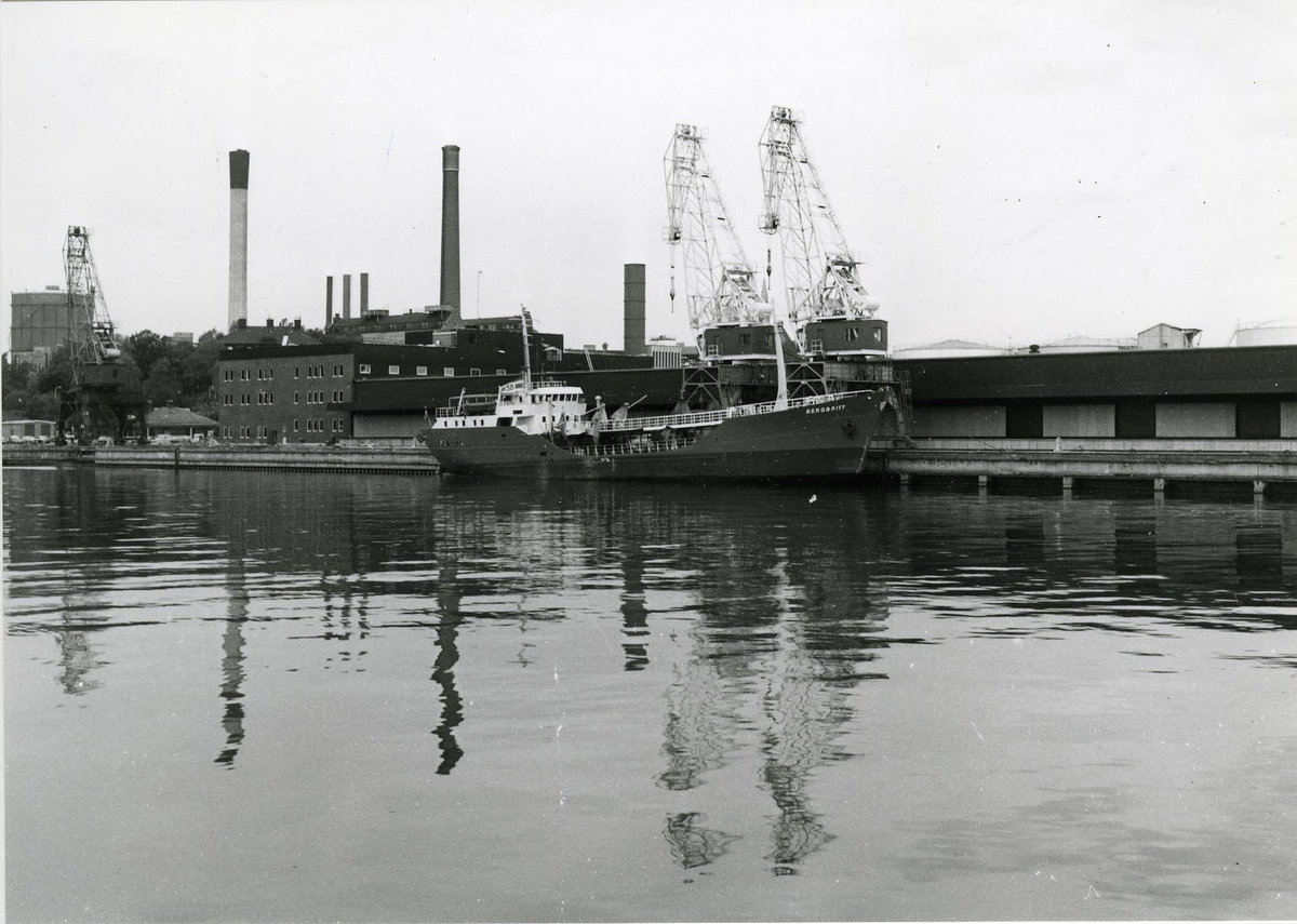 Foto i svartvitt visande hamnbild från Värtan i Stockholm, vid kaj tankmotorfartyget "Bergbritt" av Stockholm.